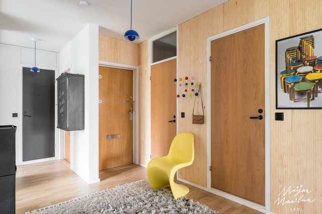 - Ruokailutila: Parkettilattiat, maalatut seinät. Vaatehuone: Muovimatto, maalatut seinät. Hyllytilaa ja tilaa ripustettaville vaatteille. Eteinen: Parkettilattia, maalatut/paneloidut seinät. Peililiukuovikaapisto.