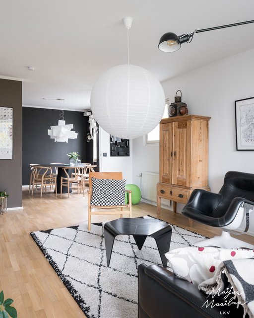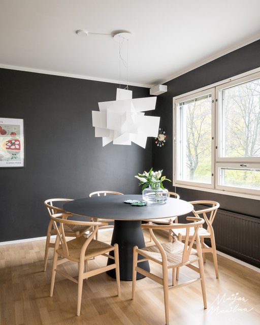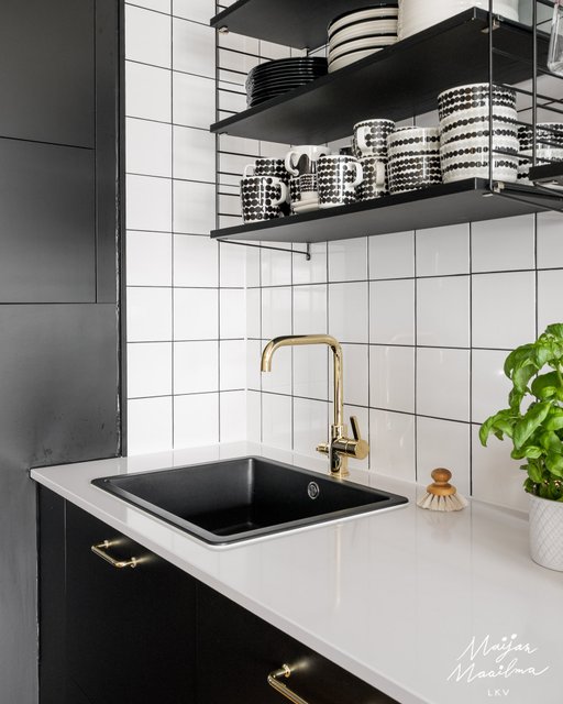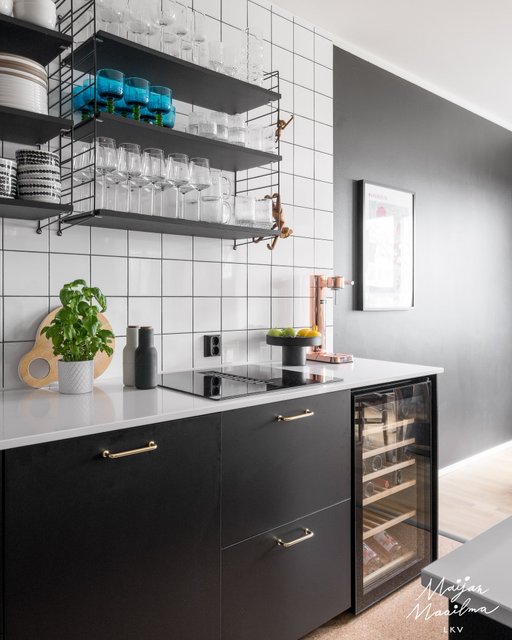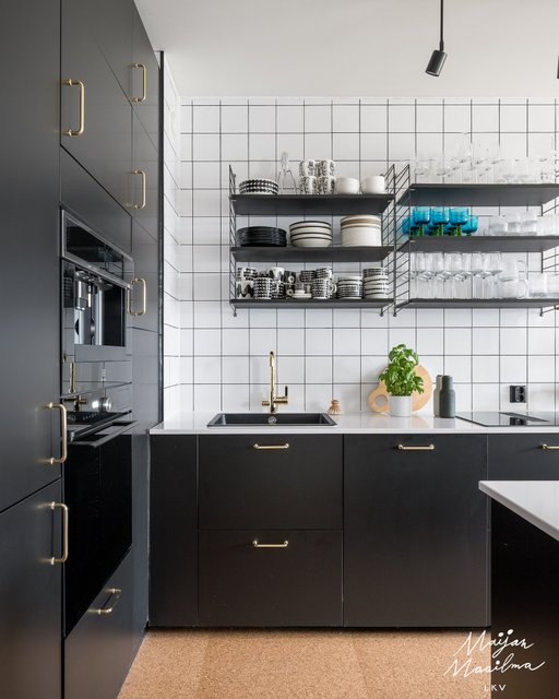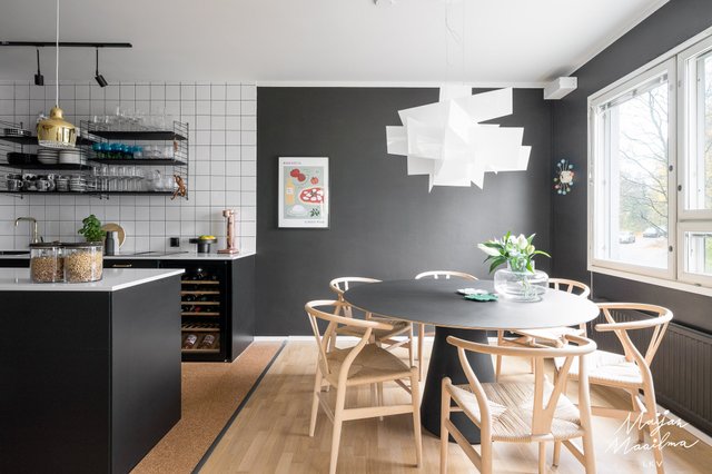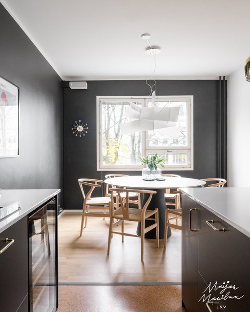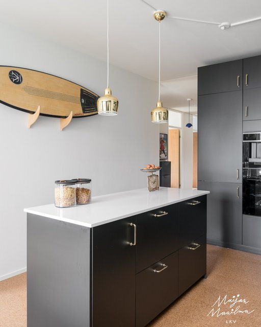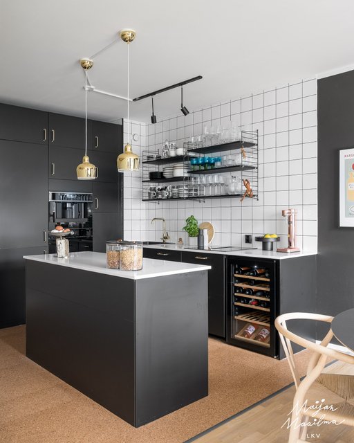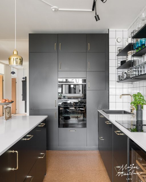 - Korkkilattia, maalatut/laatoitetut seinät. Mustat kaapistot (Ikea). Uuni, liesi integroidulla tuulettimella, kahvikone, viinikaappi, astianpesukone ja jääkaappi-pakastin.