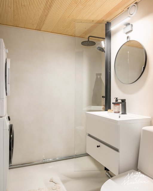 - Kylpyhuone/wc: Mikrosementöidyt lattia ja seinät. Allas, allashana, allaslaatikosto, peili valotoiminnolla, bideesuihku, wc-istuin, suihku, suihkuseinä, kaapisto, pesukoneliitäntä ja pyyhepatteri.