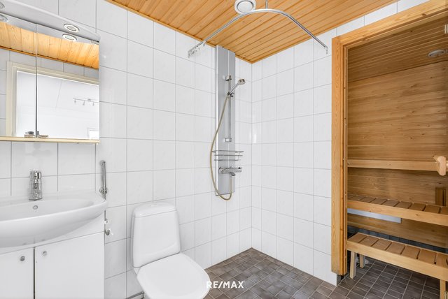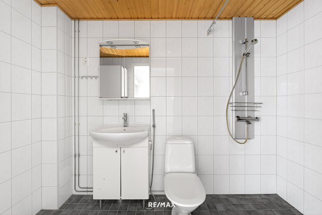 - WC-istuin, suihku, pesukoneliitäntä, lattialämmitys, pesuallas, allaskaappi, bidee-suihku, peilikaappi, ja kaappi