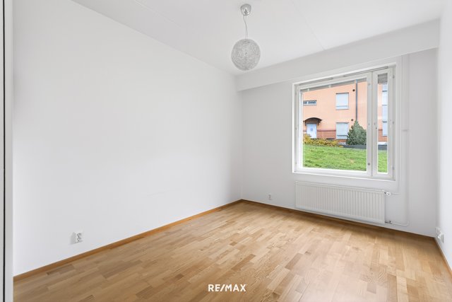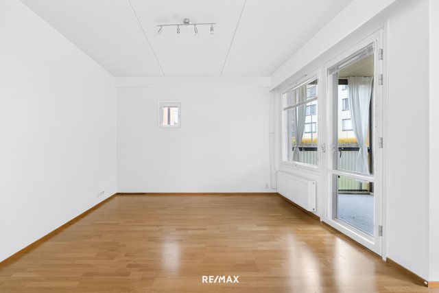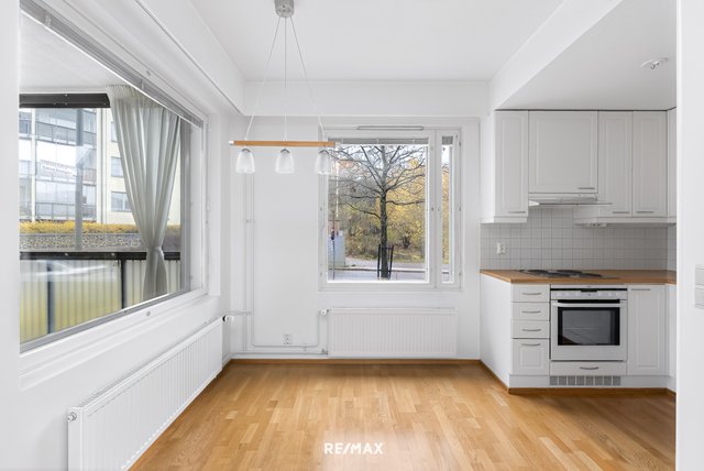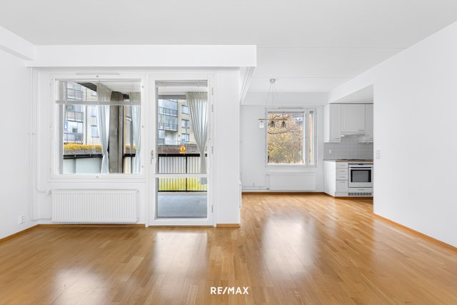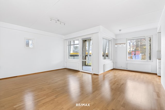 Myynnissä ensimmäisen kerroksen muuttovalmis asunto, jonka valkoiseksi maalatut seinät ja parkettilattia antavat asunnolle ajattoman ilmeen.