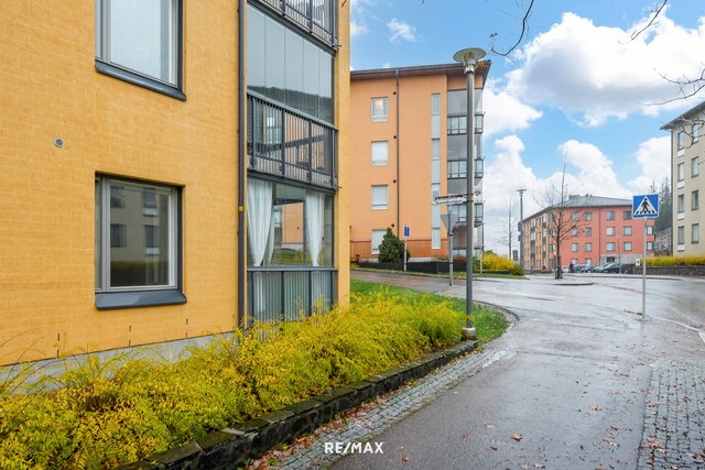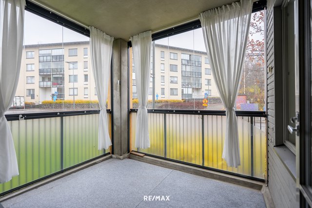 Olohuoneeseen tulee valoa isosta ikkunasta ja olohuoneen oleskelutilaa jatkaa tilava lasitettu parveke. Parvekkeelta avautuu kaupunkinäkymä. Keittiössä on valkoiset kaapistot ja AEG:n kodinkoneet. Makuuhuoneeseen mahtuu reilunkokoinen parisänky ja kaapisto tuo säilystilaa. Kylpyhuoneessa on hyvin tilaa pyykinpesutorinille ja oma sauna tuo luksusta.
