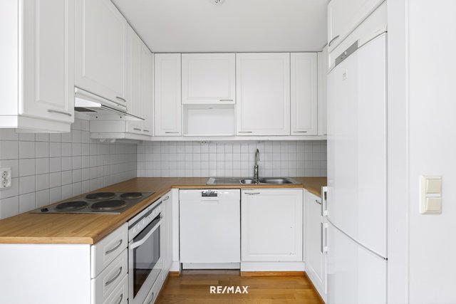 - Tehokas keittiö valkosilla kaapeilla ja AEG:n koneilla.. Laminaattitaso, välitilassa laatat, parkettilattia, maalatut seinät. Ruokailutila heti keittiön yhteydessä.