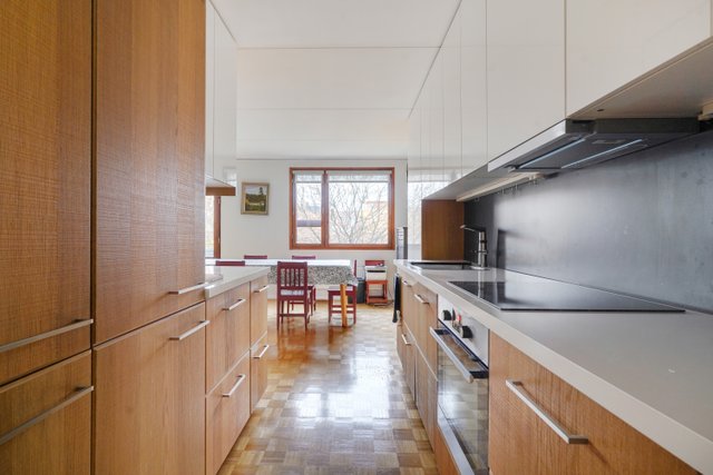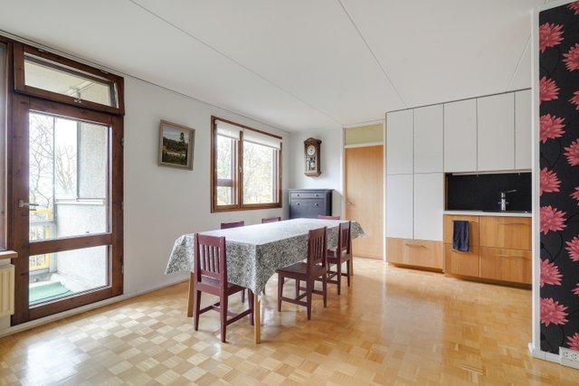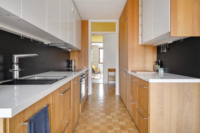 Asunnon ehdoton valtti on ison olohuoneen, modernin keittiön ja ruokailutilan yhdistelmä, jonka jatkeena on eteläparveke puistonäkymin. Keittiö on uusittu laadukkaasti 2015.