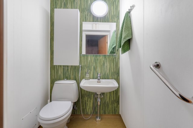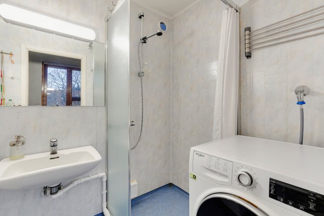 - Suihku, suihkuseinä, peili, ja pesukoneliitäntä