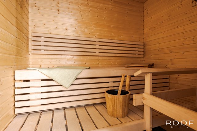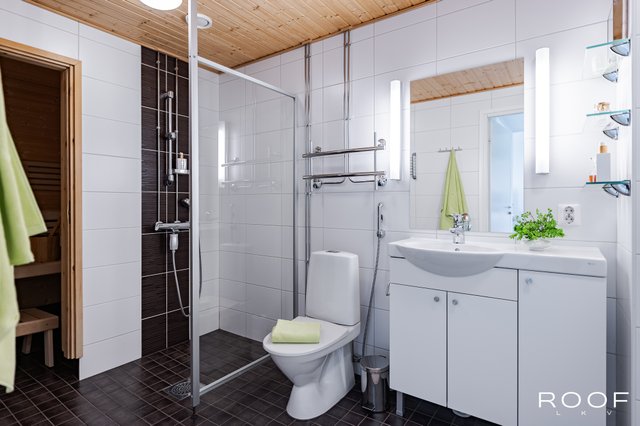 Kylpyhuone on laadukas, tyylikäs ja ajattomilla materiaaleilla sekä väreillä toteutettu. Tilaan on asennettu liukuovet, joiden takana on pyykkikaappi, tila pesutornille sekä pyyhekuivain. Mukavuuslattialämmitys on miellyttävä lisä ja pitää kylpyhuoneen lattian kosteuden poissa. Sauna on valmistettu laadukkaista materiaaleista ja säilytetty perinteisen puun värisenä.