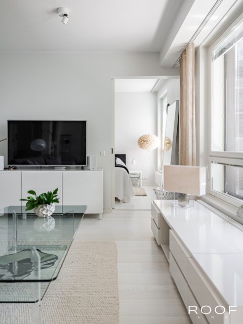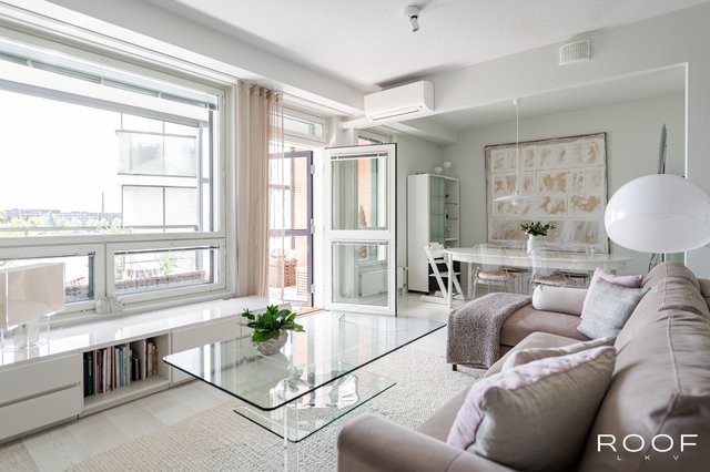 Avara ja yhtenäinen olohuone-keittiötila on saatu toteutettua siten, että toinen makuuhuone on poistettu muutostyönä ja sulautettu olohuonetilaan, joka on toteutettu rakennusaikaisena muutostyönä. Kokonaisuus on erittäin onnistunut ja vaikuttava. Tilaan saa luontevasti sijoitettua sohvaryhmän ja 4-6 hengen ruokailuryhmän. Olohuoneesta on käynti tilavalle lasitetulle parvekkeelle, jonka maisemat avautuvat etelään, suoraan järvelle ja pienvenesatamaan päin.