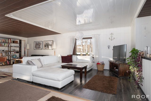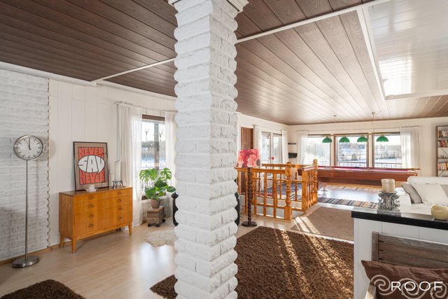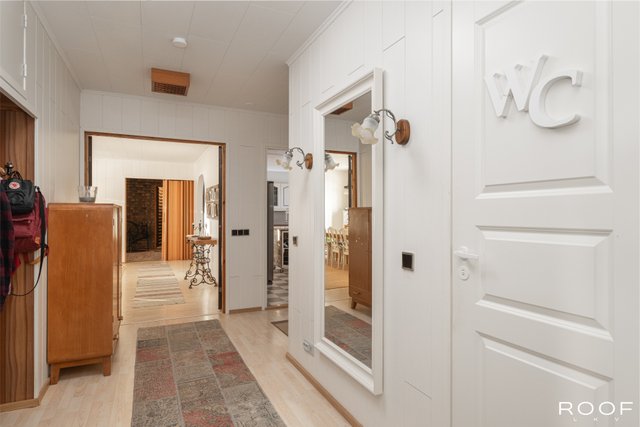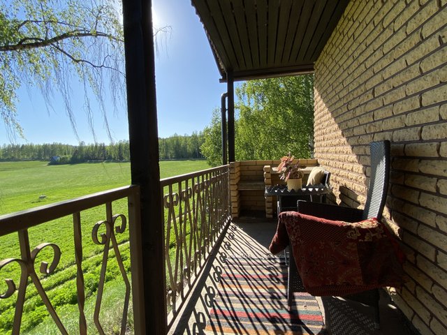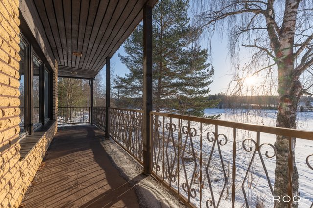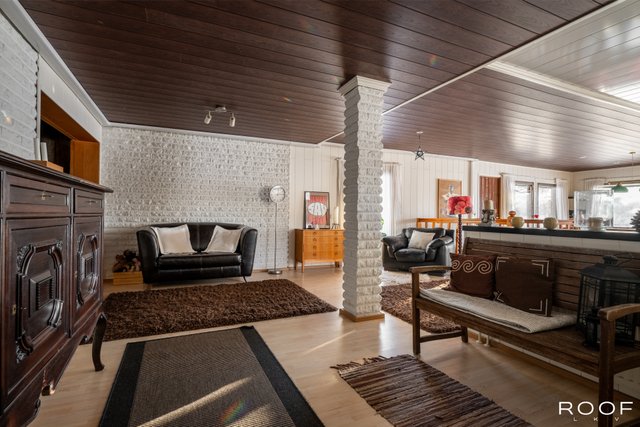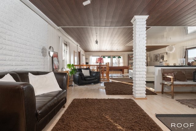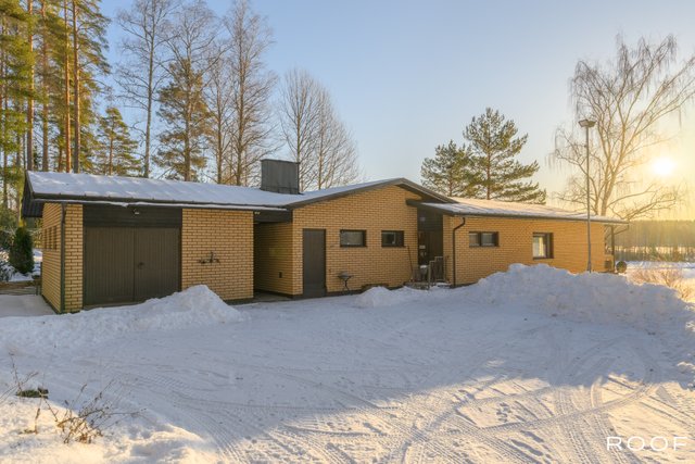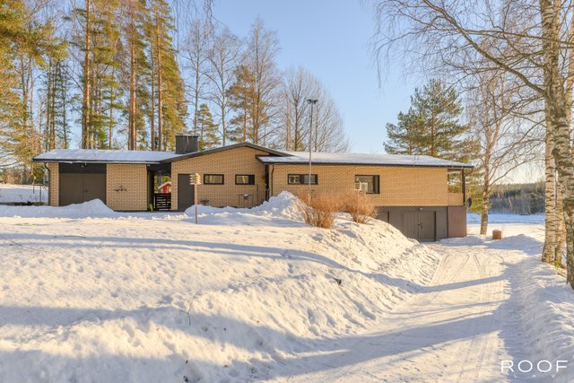 Tämä huolella pidetty ja vuosien varrella kunnostettu koti tarjoaa toimivaa ja väljää asumista yhdessä tasossa. Kodin sydän on suuri olohuone, josta on käynti huoneen kahta seinustaa kiertävälle parvekkeelle ja avoimiin peltomaisemiin. Olohuoneen yhteydessä sijaitsevat tunnelmallinen takkahuone sekä remontoitu kylpyhuone ja puusauna. Keittiö ja tilava ruokailuhuone muodostavat kodin toisen keskipisteen, ja talon rauhallisempaan päähän sijoittuvat kolme makuuhuonetta. Arkea helpottavat kaksi vaatehuonetta, erillinen wc, tilava eteinen ja kodinhoitohuone.