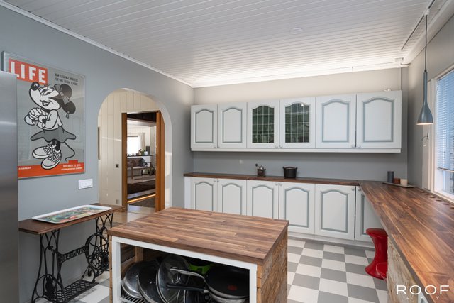 Keittiön pöytälevyjen, lattian, jääkaappi-pakastimen, lieden ja valaistuksen uusiminen.