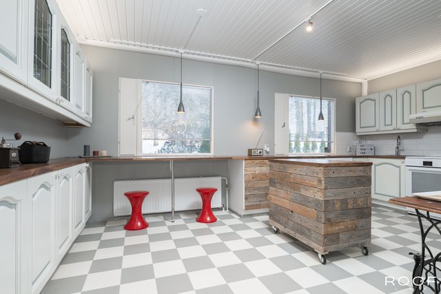 - Takkahuone: Varustus: takka. Lattia: laminaatti. Seinät ja katto: kelopuuverhous Vaatehuone 2kpl, varasto, tuulikaappi, 2 x eteinen. Kaksi autotallia (asuinrakennuksen pohjakerroksessa yksi ja toinen erillisenä rakennuksena, joka on liitettynä katoksella asuintaloon).