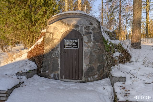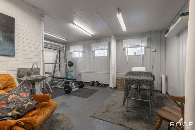 - Lämmin autotalli, joka on yhteisellä katolla liitetty asuinrakennukseen. Autotallissa on tällä hetkellä kuntosali/työtila. Maakellari