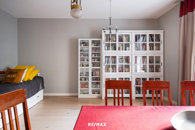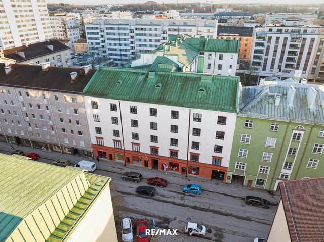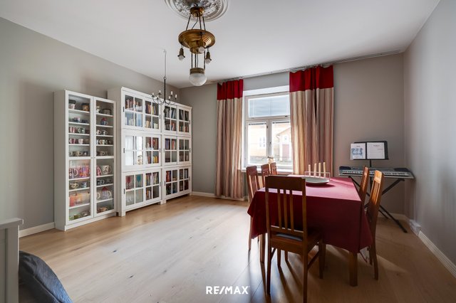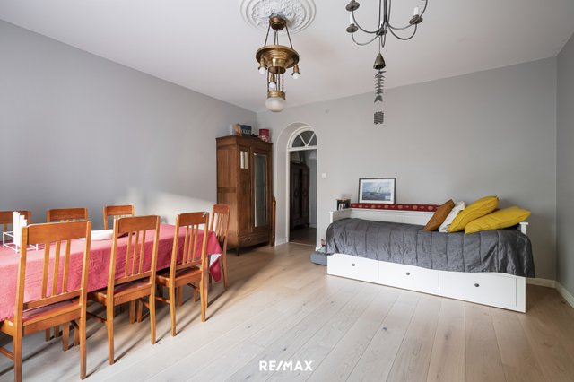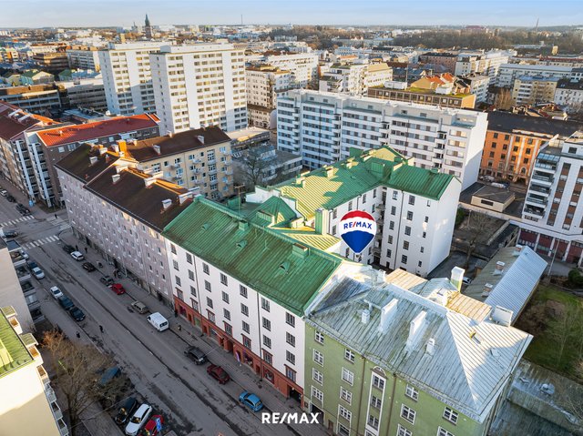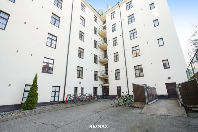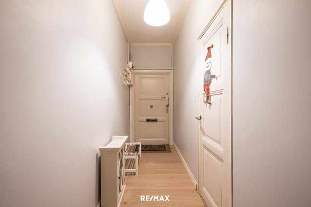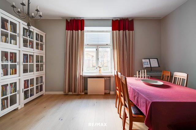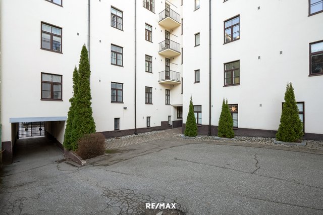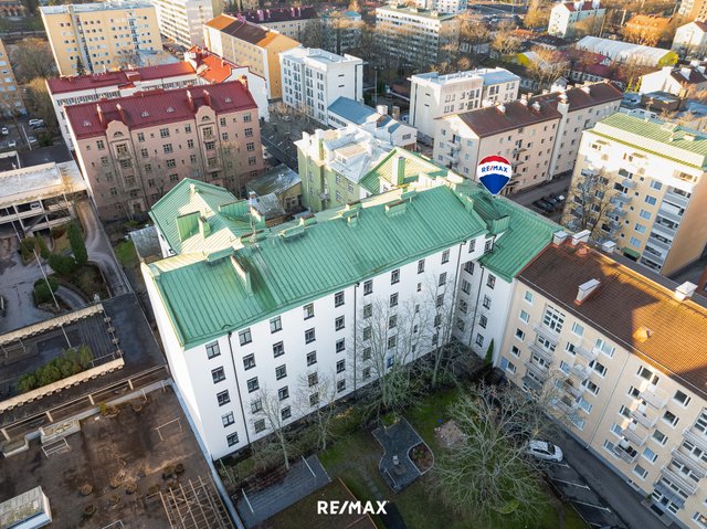Hyvin hoidettu taloyhtiö huokuu samaa arvokkuutta kuin itse asunto. Yhteiset tilat ovat siistit ja tunnelmaltaan linjassa rakennuksen historian kanssa. Asunnon käytössä ovat lisäksi hyvät säilytystilat sekä ullakolla että kellarissa.