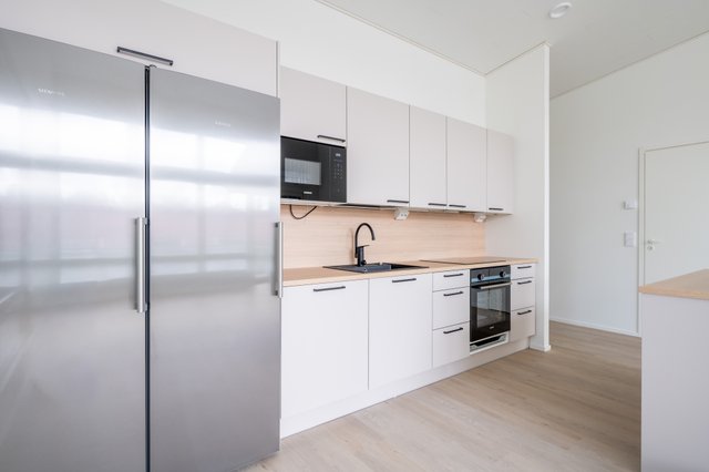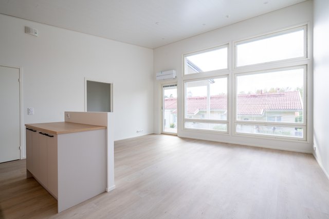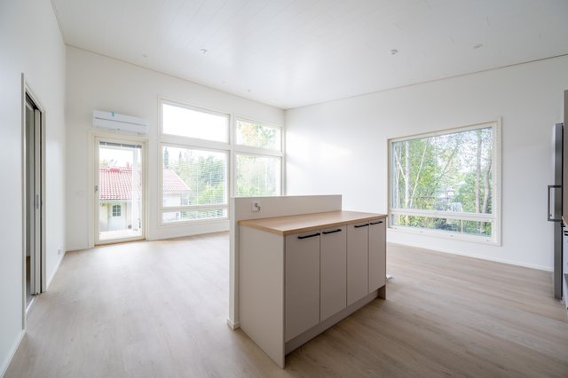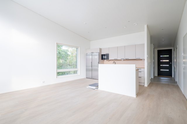 Asunnossa on tilava avokeittiö, joka avautuu olohuoneeseen, ja yhdessä ne muodostavat kodin sydämen. Keittiö on varustettu laadukkailla Puustellin kalusteilla ja nykyaikaisilla kodinkoneilla, jotka tekevät ruoanlaitosta nautinnon. Olohuoneesta ja yhdestä makuuhuoneesta avautuvat näkymät omalle terassille ja piha-alueelle, joka suuntautuu kaakkoon, tarjoten valoa ja rauhaa.