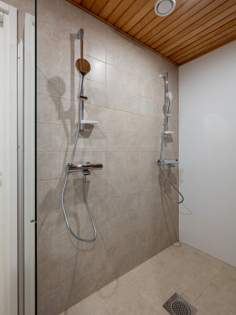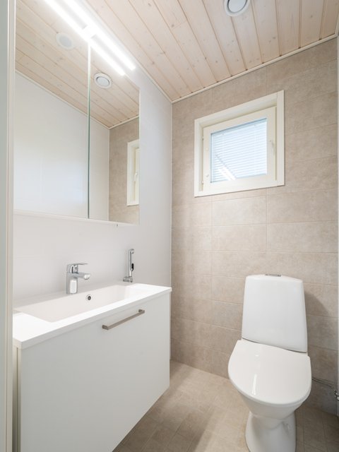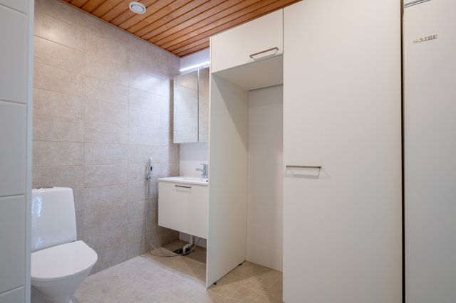 - WC-istuin, suihku, suihkuseinä, pesukoneliitäntä, lattialämmitys, peilikaappi, bidee-suihku, ja allaskaappi