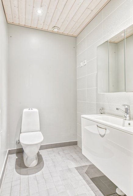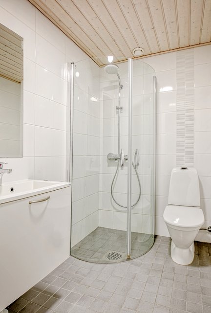 - WC-istuin, lattialämmitys, peilikaappi, pesuallas, allaskaappi, suihku, suihkuseinä, ja bidee-suihku