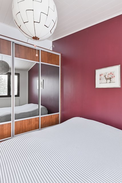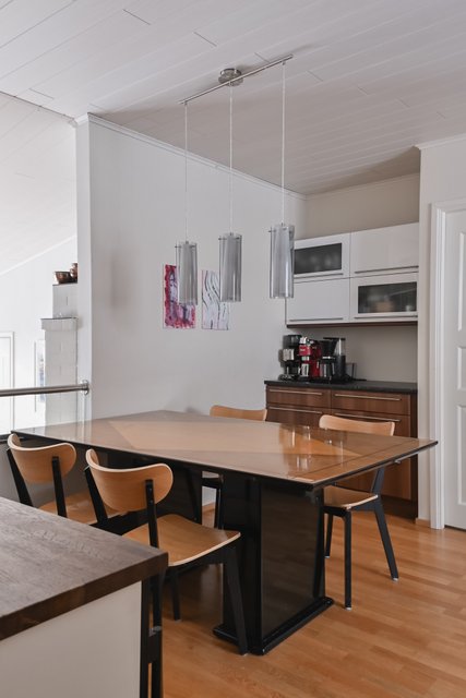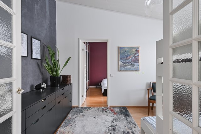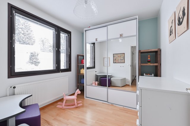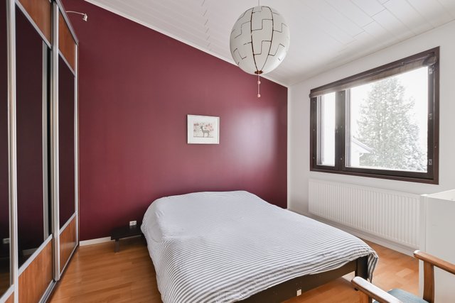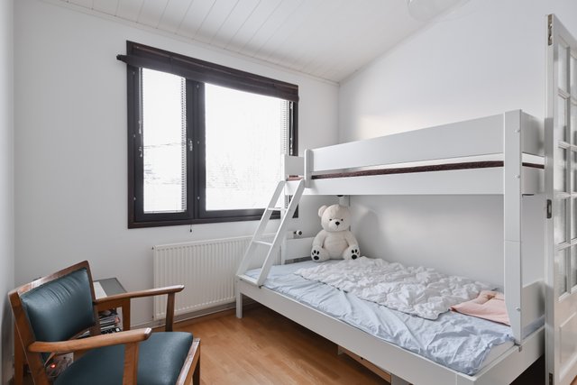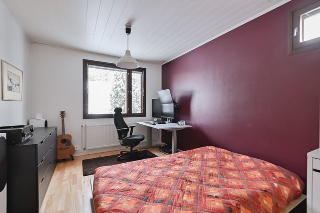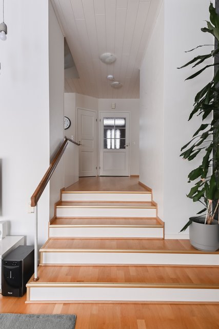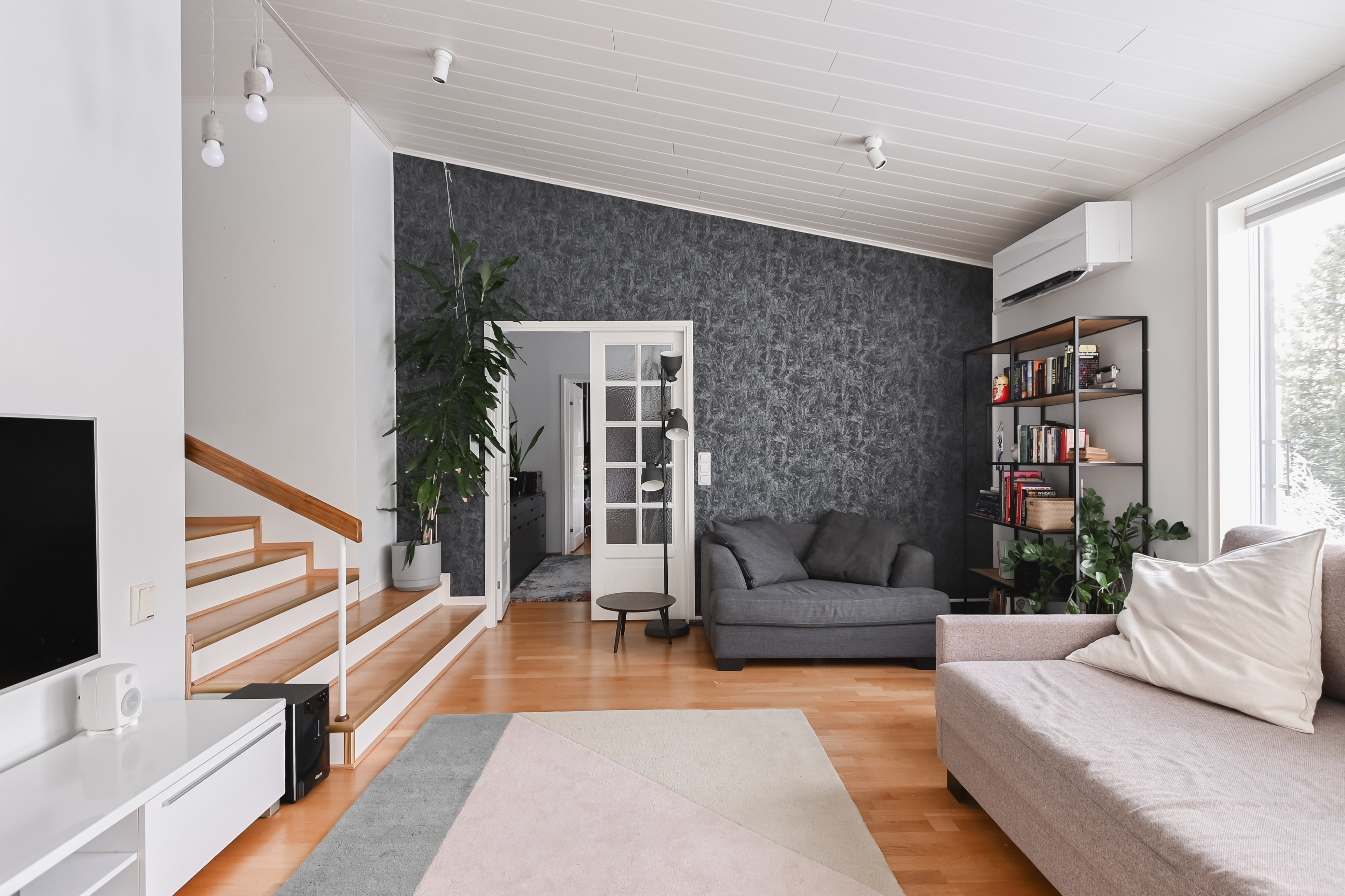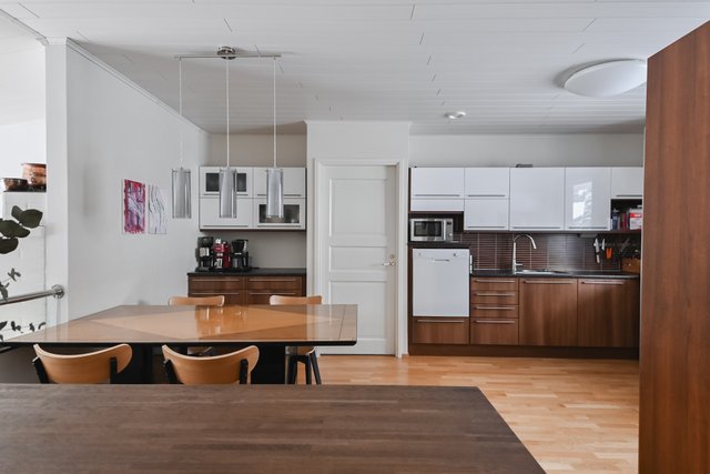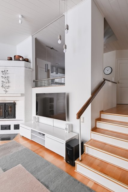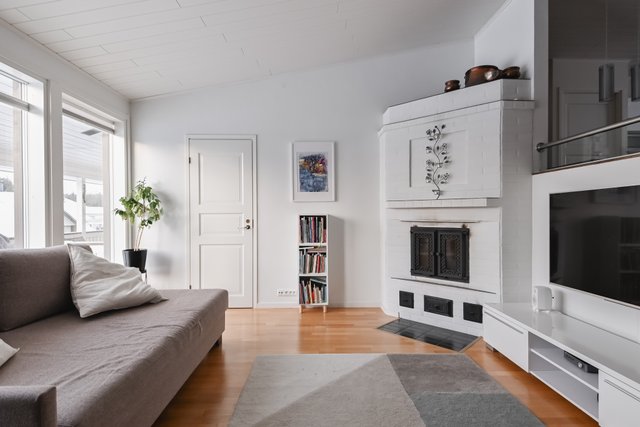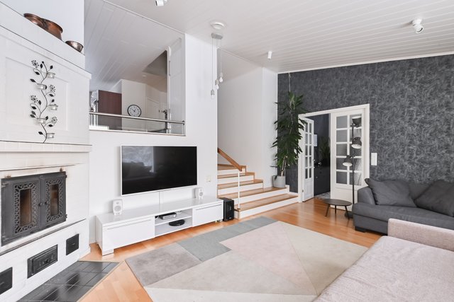 Kodin sydän on avara olohuone, jossa on varaava takka, joka luo lämpöä ja tunnelmaa. Keittiö on hyvin varusteltu ja siellä on tilaa ruoanlaittoon sekä yhteisiin hetkiin perheen kanssa. Kolme makuuhuonetta, kirjasto ja työtila tarjoavat monipuolisia mahdollisuuksia asumiseen ja etätyöskentelyyn.