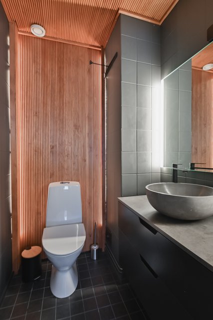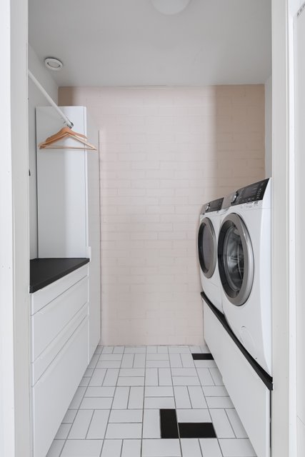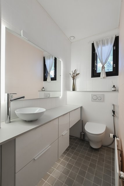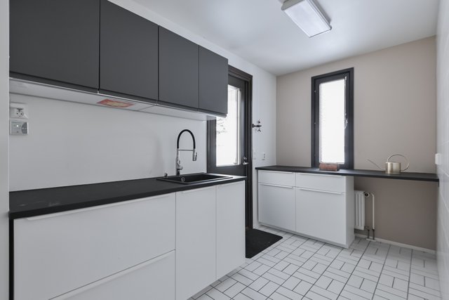 - Lattialämmitys, pesukone, kuivausrumpu, pesuallas, pesukoneliitäntä, ja pöytätaso
