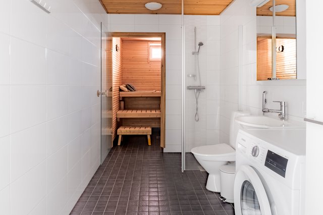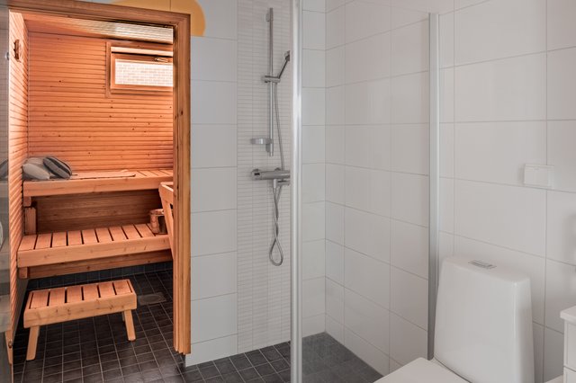 - WC-istuin, suihkuseinä, pesukoneliitäntä, lattialämmitys, peilikaappi, ja suihku