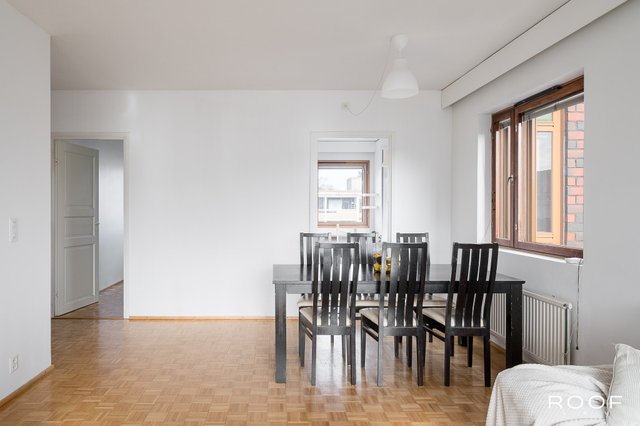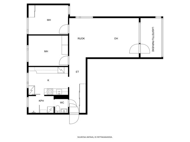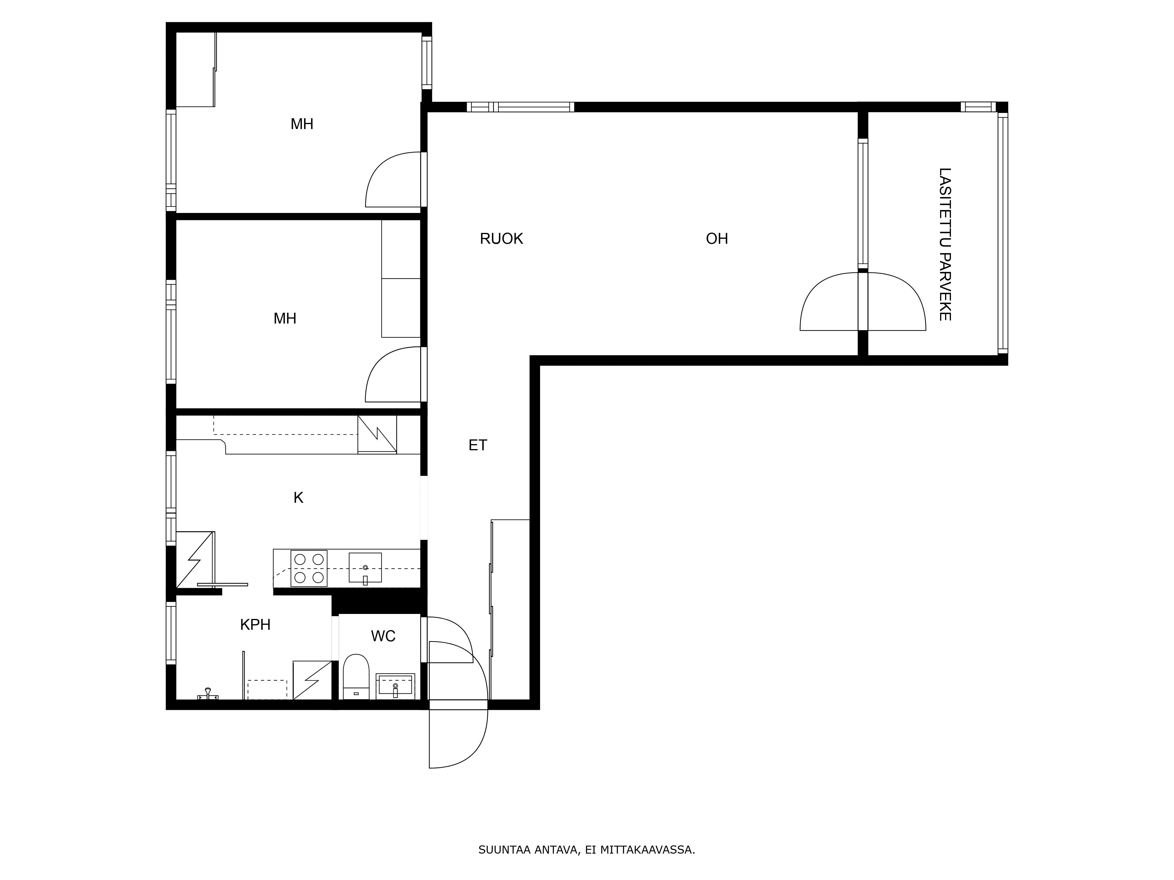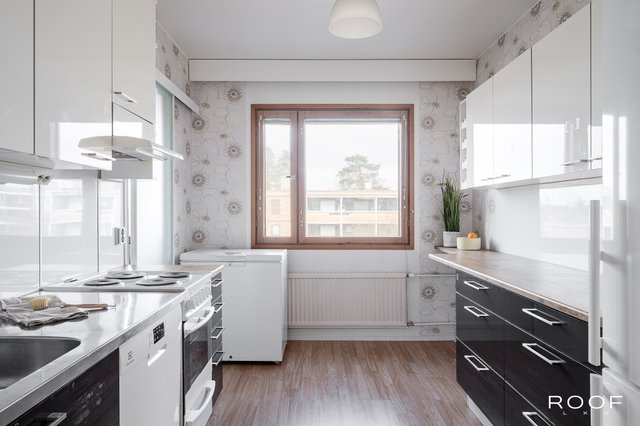Tämä koti hurmaa valollaan ja tilavuudellaan! Kolmeen suuntaan avautuvat ikkunat tekevät kodista erityisen valoisan ja avaran. Asunnon keskipisteenä on tilava olohuone, jonne mahtuu myös ruokailuryhmä. Olohuoneesta on käynti suurelle lasitettulle parvekkeelle, joka suuntautuu etelään, tarjoten loistavan paikan aamukahveille tai ilta-auringosta nauttimiseen. Erillisestä keittiöstä löytyy hyvin kaappitilaa ja työtasoa. Asunnossa lisäksi kaksi hyvänkokoista makuuhuonetta, tilava kylpyhuone ja erillinen wc.