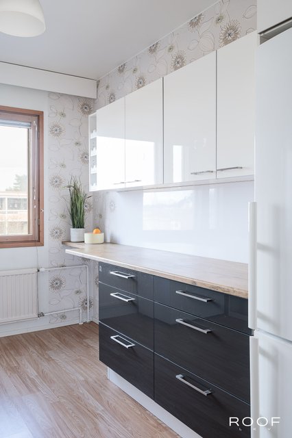 - Jääkaappipakastin, liesi, liesituuletin, astianpesukone, ja uuni