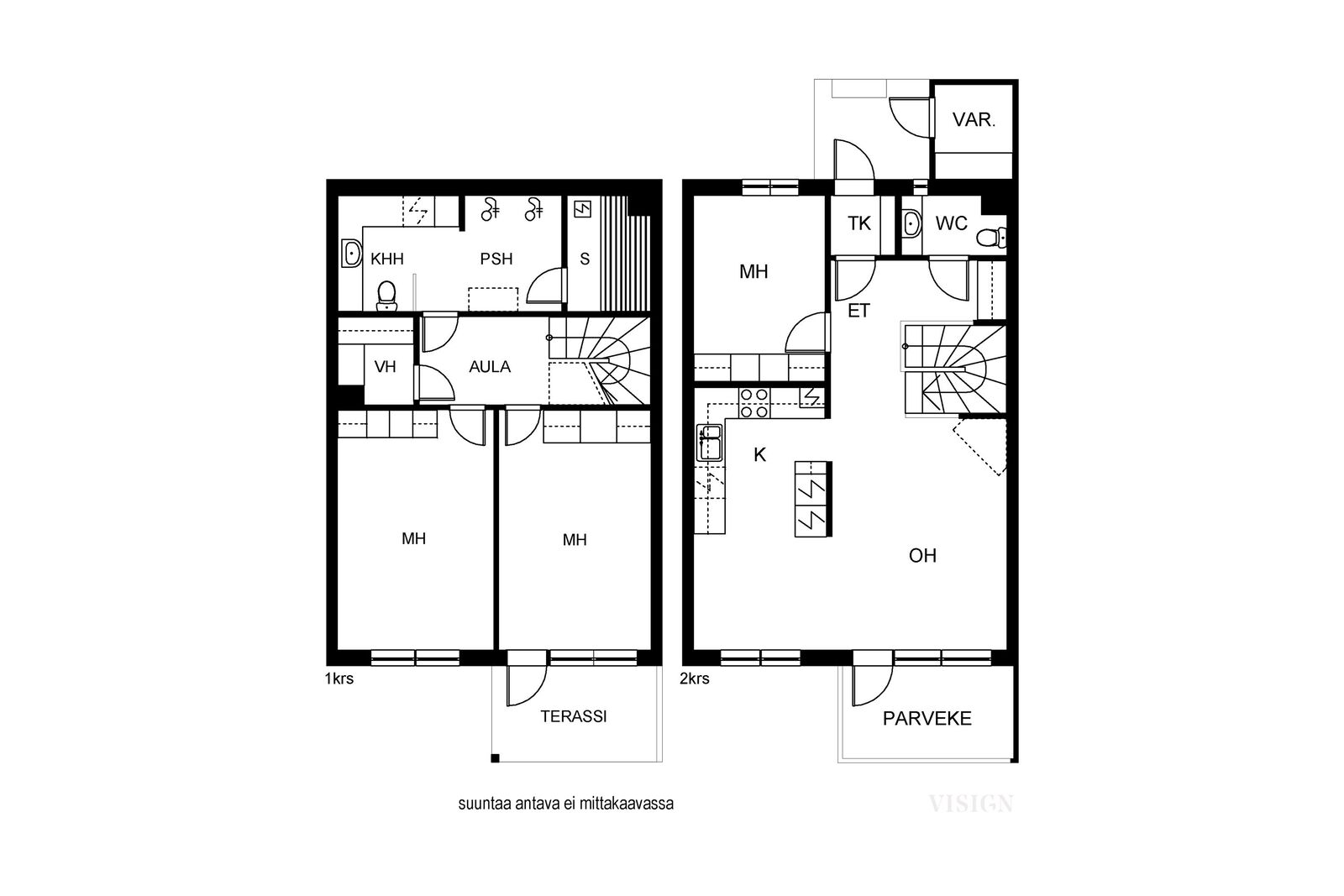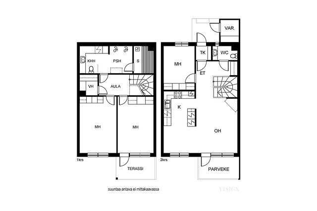 Kodin pohjaratkaisu on kahdessa kerroksessa: yläkerran avara keittiö ja olohuone muodostavat kodin sydämen. Lisäksi yksi makuuhuone tarjoaa mahdollisuuden vaikkapa etätyöpisteelle. Parvekkeelta voit seurailla vuodenaikojen vaihtumista kauniissa metsämaisemissa. Alakerrassa on kahden makuuhuoneen lisäksi kodinhoitohuone, kylpyhuone ja sauna. Alakerrasta on käynti rauhaisalle terassille, jossa on mukava vilvoitella saunasta. Kaksi erillistä wc:tä ja vaatehuone tuovat lisäplussaa arjen toimivuuteen! Ajattomasti valitut materiaalit kestävät aikaa ja sopivat moneen makuun. Ilmalämpöpumppu helpottaa kesän helteillä.