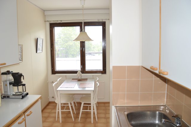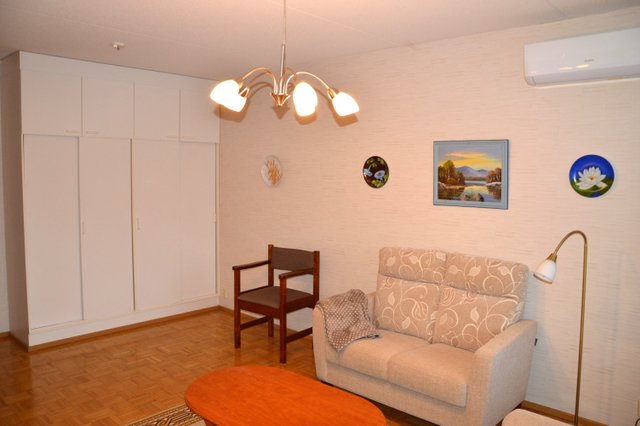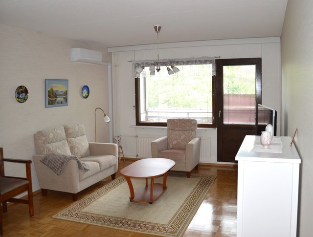 Asunto on paljolti alkuperäisessä, mutta oikein siistissä kunnossa. Tilavasta olohuoneesta on käynti lasitetulle parvekkeelle. Viilennystä varten olohuoneessa on ilmalämpöpumppu. Erillisessä keittiössä on hyvin tilaa ruokapöydälle ja makuuhuoneessa on kaapistoissa tilaa vaatesäilytystä varten. Kylpyhuone on hyvän kokoinen pesutilaksi ja pyykkihuoltoon. Asunnossa on sähkökiukaalla lämpiävä sauna.
