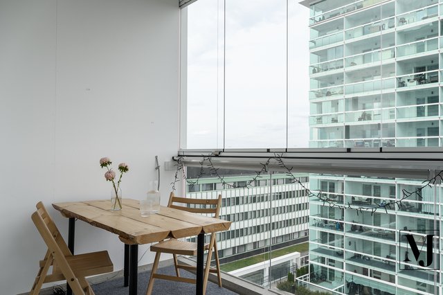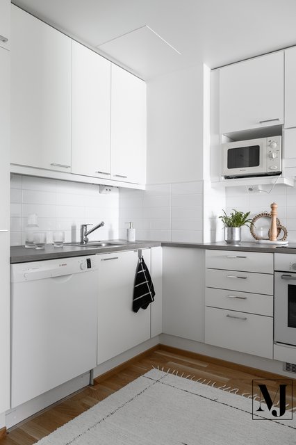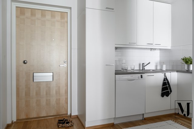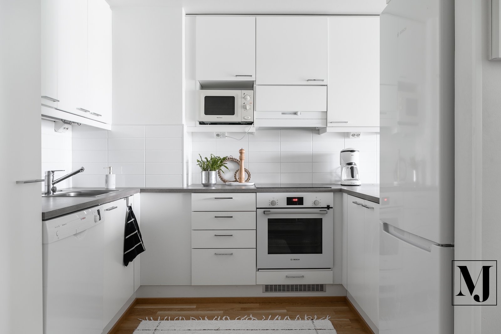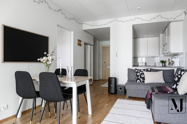 Keittiö on moderni ja ajattoman tyylikäs. Avoin ratkaisu yhdistyy olohuoneeseen, jossa on tilaa niin sohvalle kuin ruokapöydälle. Etelään avautuva lasitettu parveke tuo valoa ja tarjoaa viihtyisän paikan arjen rentoutumiselle.