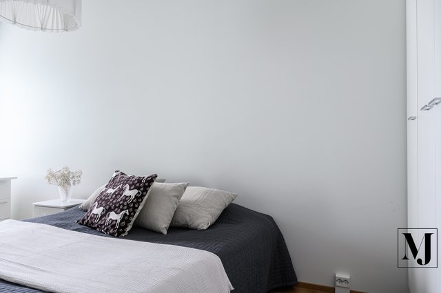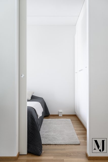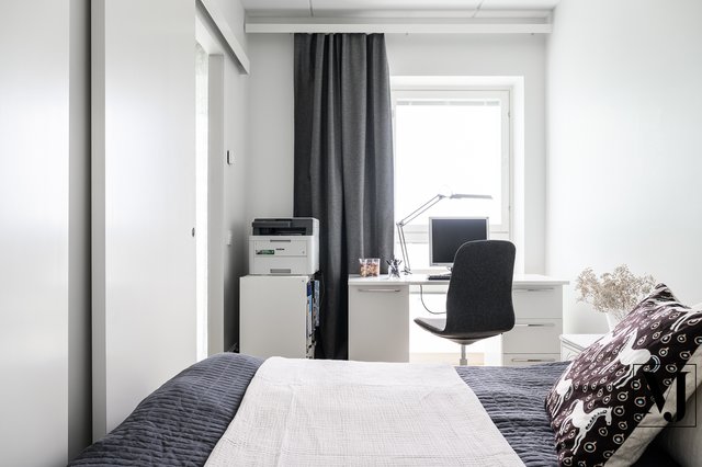 Tilava makuuhuone tarjoaa runsaasti säilytystilaa vaatehuoneen ansiosta, ja ikkunan alle mahtuu hyvin työpiste, mikä tekee tilasta käytännöllisen myös etätyöhön.