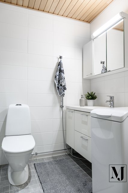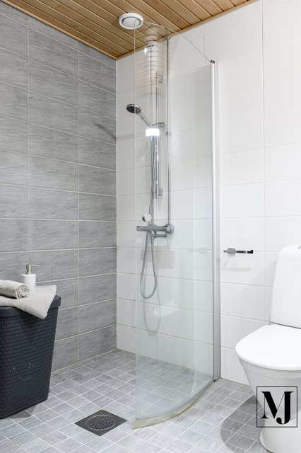- WC-istuin, suihku, suihkuseinä, pesukoneliitäntä, lattialämmitys, peilikaappi, allaskaappi, ja pesuallas