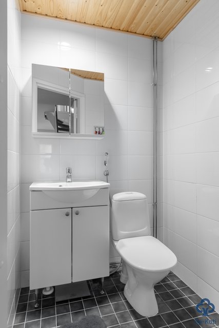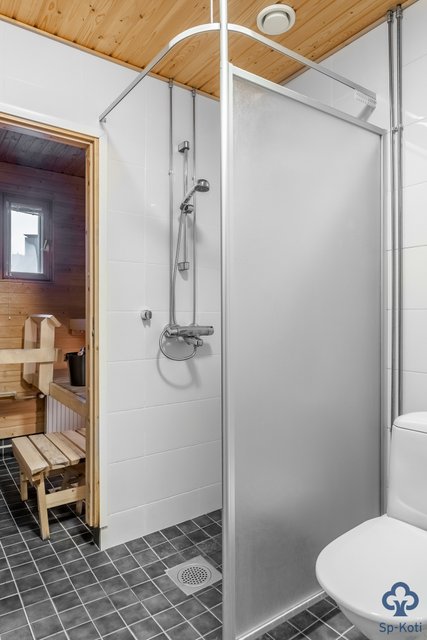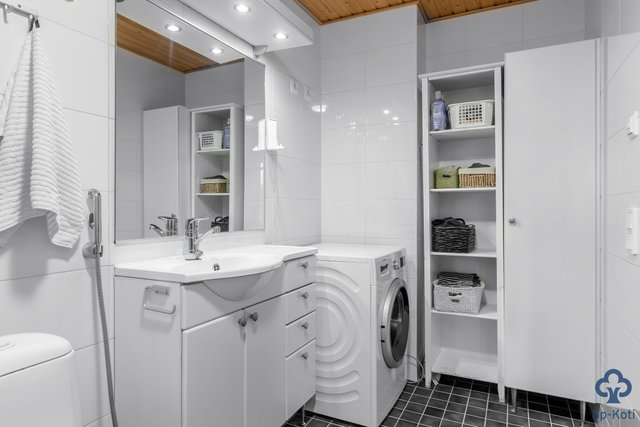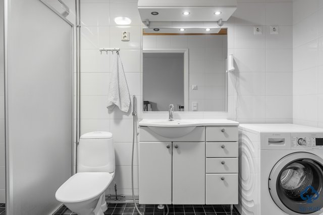 - WC-istuin, suihku, pesukone, pesukoneliitäntä, suihkuseinä, pesuallas, peili, lattialämmitys, ja bidee-suihku