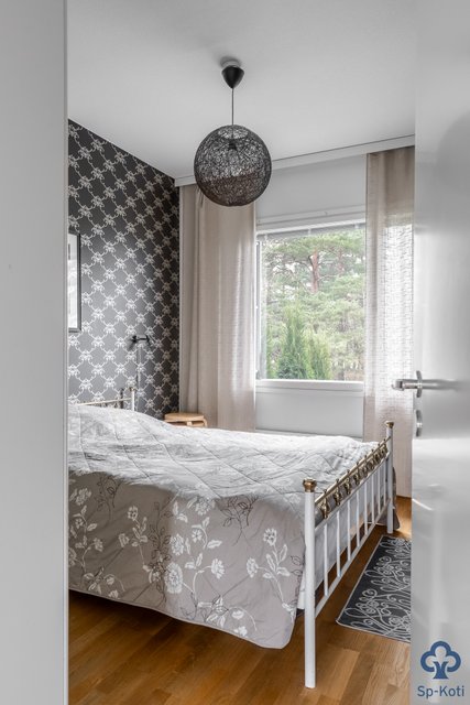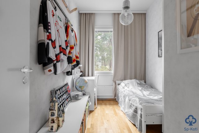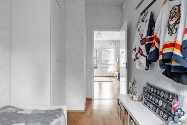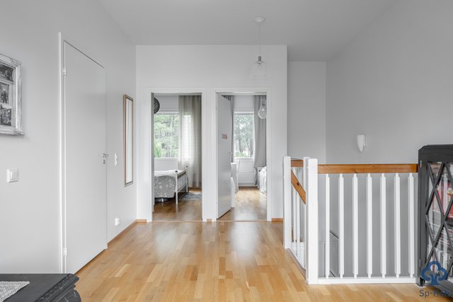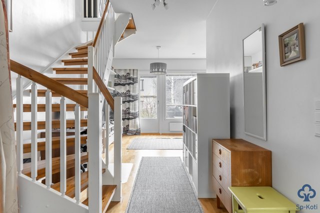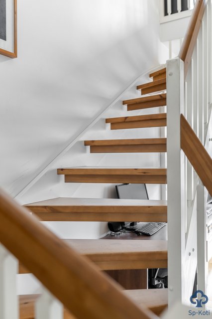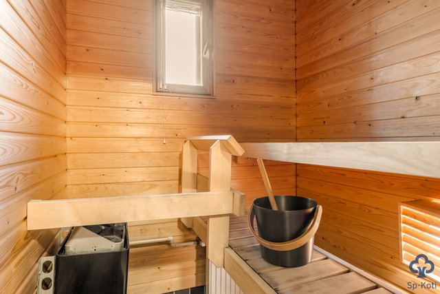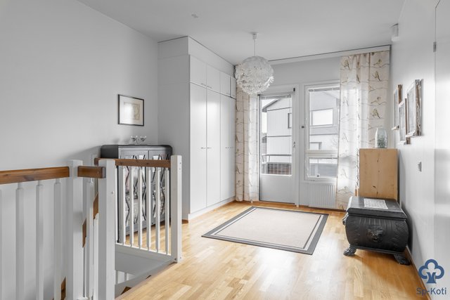 Yläkerrassa sijaitsevat kaksi makuuhuonetta, tilava aulatila, ikkunallinen sauna sekä kylpyhuone, jossa on kätevästi myös pyykinhoitotilat. Aulatila toimii mainiosti esimerkiksi työ- tai leikkitilana ja siitä on käynti parvekkeelle, joka tuo asumiseen lisää viihtyisyyttä ja valoa.