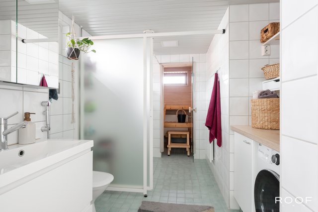 - VARUSTUS: Suihku Suihkuseinä Wc istuin Pesukoneliitäntä Hana Allas Peilikaappi Allaskaapisto Lattialämmitys LATTIA: Laatta SEINÄT: Laatta