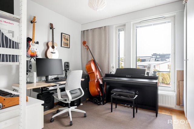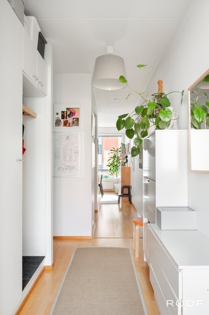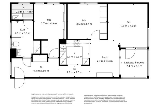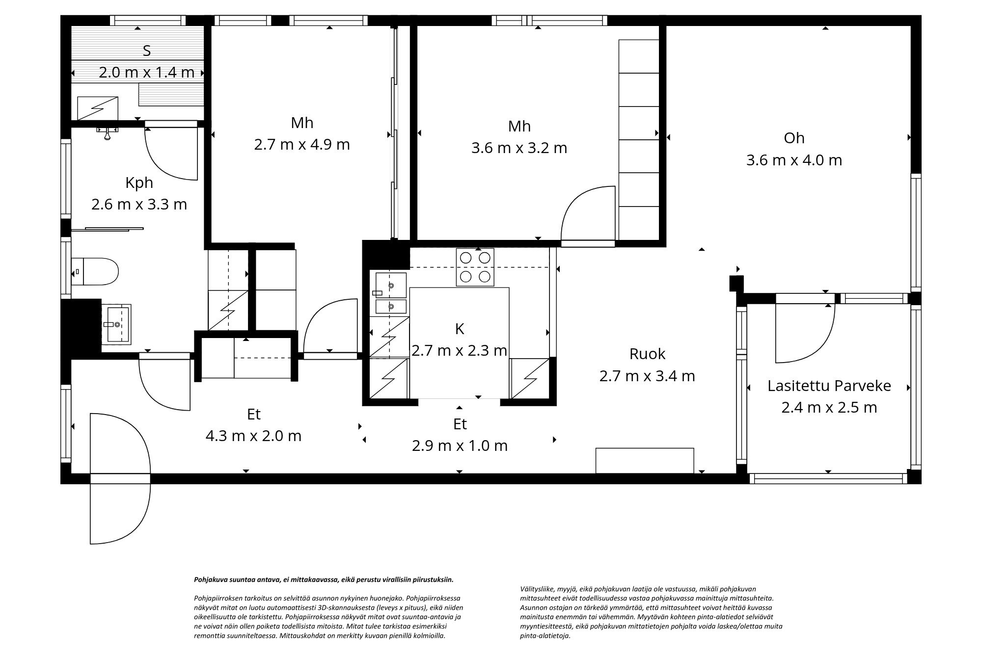 - Pinta-alaa ei ole tarkistusmitattu. Kohteen markkinoinnissa käytetään mittatiedoilla varustettua pohjapiirrosta. Pohjapiirroksen tarkoitus on helpottaa ostajan ostopäätöstä ja selvittää asunnon nykyinen huonejako. Ostaja on tietoinen, että pohjakuva on suuntaa antava, ei mittakaavassa, eikä perustu virallisiin piirustuksiin. Pohjapiirroksessa näkyvät mitat on luotu automaattisesti 3D-skannauksesta (leveys x pituus), eikä niiden oikeellisuutta ole tarkistettu. Pohjapiirroksessa näkyvät mitat ovat suuntaa antavia ja ne voivat näin ollen poiketa todellisista mitoista. Mitat tulee tarkistaa esimerkiksi remonttia suunniteltaessa. Mittauskohdat on merkitty kuvaan pienillä kolmioilla. Välitysliike,