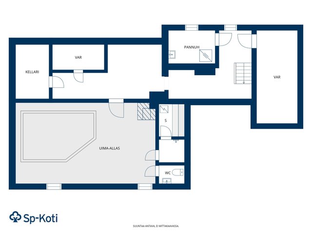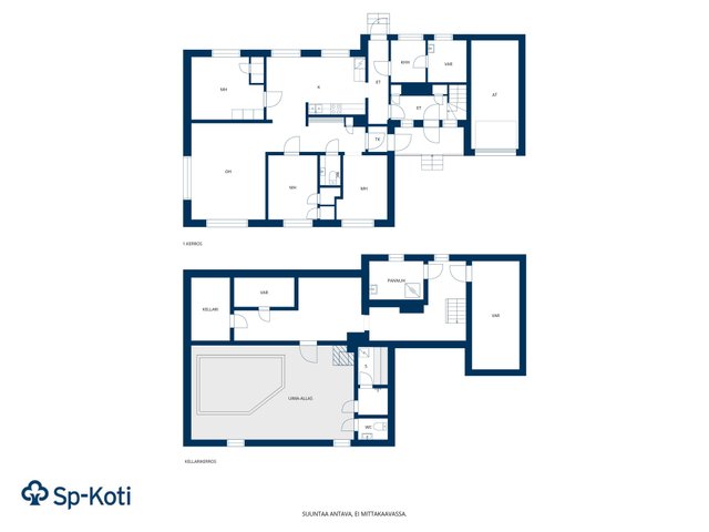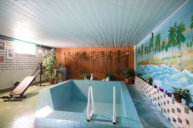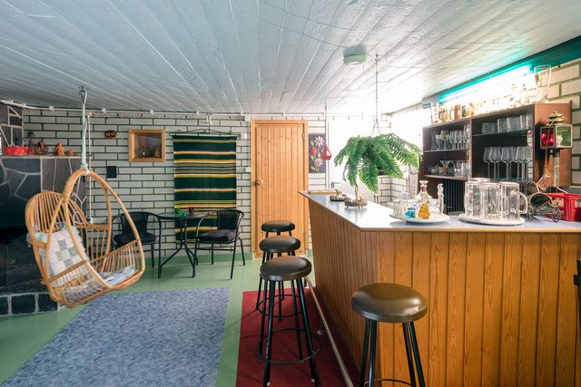 - Keskeneräinen alakerta, uima-allas jossa ei ole vettä, eikä ole käytetty 30v. Baaritiski ja oleilutila/takkahuone. Wc. Alakerrassa myös yksi vierashuone, kylmäkellari ja varasto.