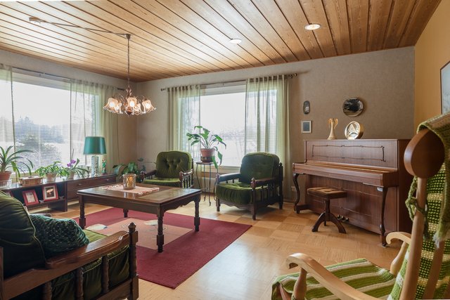 Yläkerrassa keittiö, olohuone, kolme makuuhuonetta, kodinhoitohuone ja wc. Alakerrassa vielä vieraille yksi huone ja hyvin säilytystilaa. Takkahuoneessa baaritiski ja uima-allas, jota tosin ei ole vuosikymmeniin käytetty, hyvä ideoija keksii sille ehkä jotain muuta hyödyllistä käyttöä.