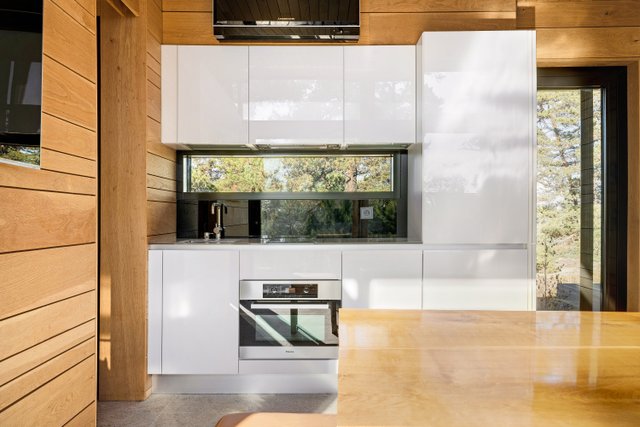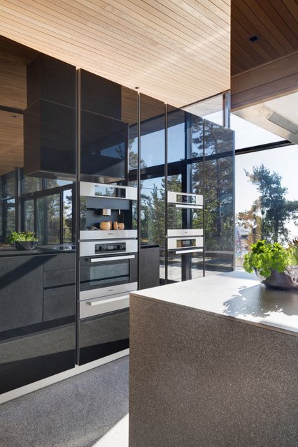 - Mielen kodinkoneet: jääkaappi/pakastin, induktioliesi, erillisuuni, höyryuuni, kahvikone, liesituuletin hormiin, mikroaaltouuni, astianpesukone. Keittiön tasot ja saarekkeen kaapisto-ovet graniittia. Muut keittiön kaapisto-ovet lasia. Lattia- ja seinäpinnoitteet: lattia graniittilaatta, seinät tammipaneeli.