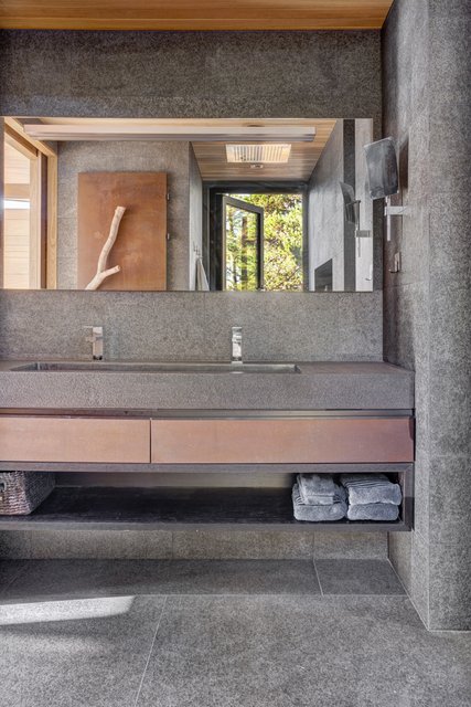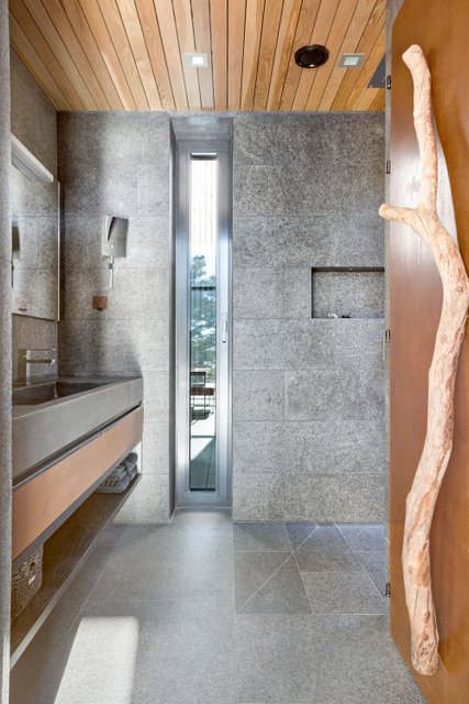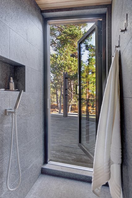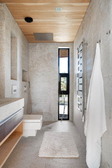 - Sade- ja käsisuihku, peili, pesuallastaso hyllyineen. Päärakennuksen kylpyhuoneen edustan terassilla ulkosuihku. Vierasmajassa ja saunassa sähkökiertoinen lattialämmitys. Lattia- ja seinäpinnoitteet: lattia graniittilaatta, seinät laatta.