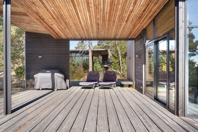 - Terassin ilmansuunnat: Etelä, länsi, kaakko, lounas Terassin kuvaus: Isot terassit kiertävät päärakennusta, vierasmajaa sekä saunaa. Kaikki rakennukset kytkeytyvät toisiinsa lehtikuusesta rakennetuin käytävin.