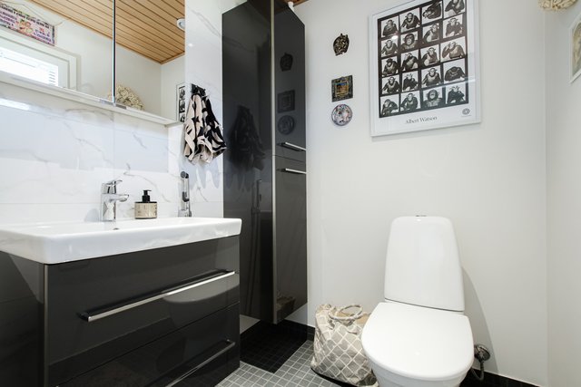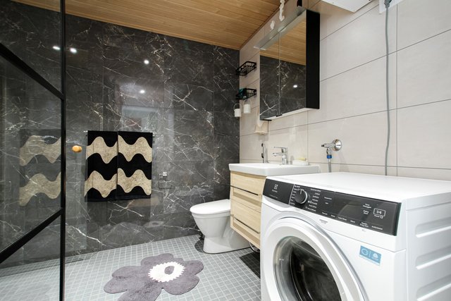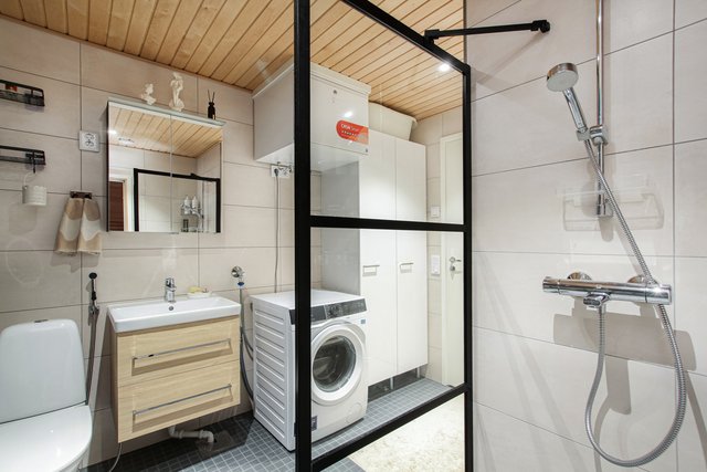 - WC-istuin, suihku, pesukoneliitäntä, suihkuseinä, peilikaappi, lattialämmitys, pesuallas, ja allaskaappi