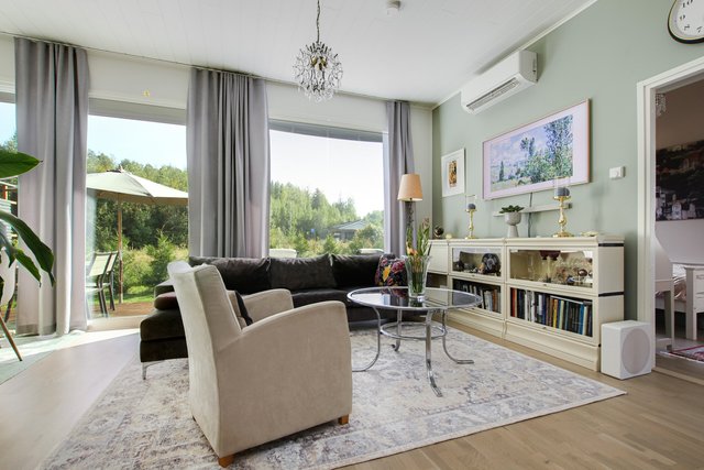 - Ilmalämpöpumppu, olohuoneen ikkunoiden taiteverhot