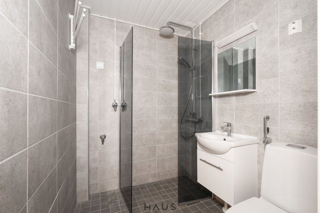 - WC-istuin, suihku (sadesuihku), suihkuseinä, pesukoneliitäntä, lattialämmitys (sähköinen), peili, allaskaappi, ja bidee-suihku
