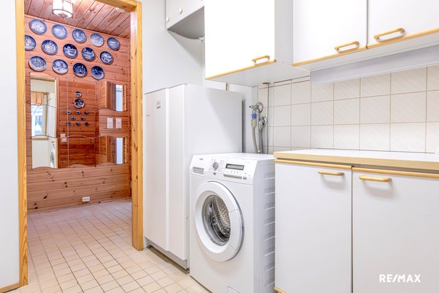 - Pesukoneliitäntä, pöytätaso, lattiakaivo, pesuallas, ja pyykkikaapit