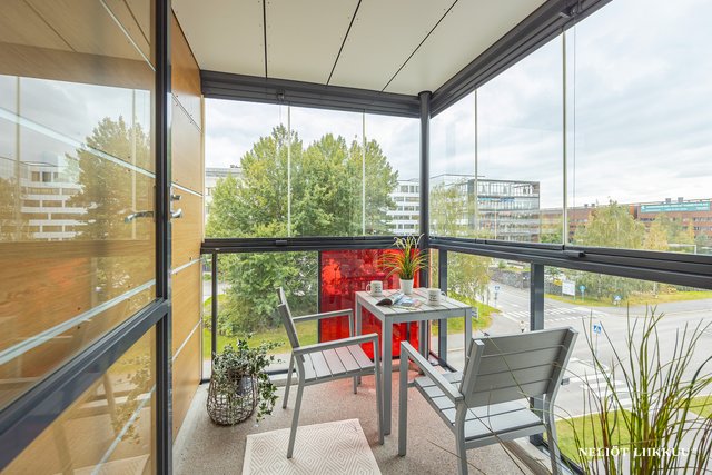 UUTTA MYYNNISSÄ TAPIOLASSA! Tässä valoisassa tilavassa kaksiossa on loistava pohja. Asunto on helppo kalustaa ja olohuone avokeittiöön mahtuu hyvin ruokapöytä sekä sohvaryhmä ja makuuhuoneeseen parisängyn lisäksi työpöytä. Valoa asuntoon tuo lähes koko seinän levyiset isot ikkunat. Olohuoneesta on käynti lasitetulle parvekkeelle, josta on vehreät näkymät.