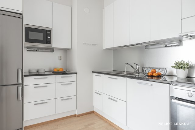 Keittiö on toimiva, siellä on hyvin kaappi- sekä laskutilaa ja sinne mahtuu isompikin ruokapöytä. Kylpyhuone on tyylikäs ja tilava ja siellä on paikka myös pesutornille. Kylpyhuoneen yhteydessä on oma sauna. Säilytystilaa on reilusti, eteisessä on kaapistot ja makuuhuoneessa on kaapistoja koko seinän leveydeltä. Huoneistolle kuuluu lisäksi lämmin irtaimistovarasto.