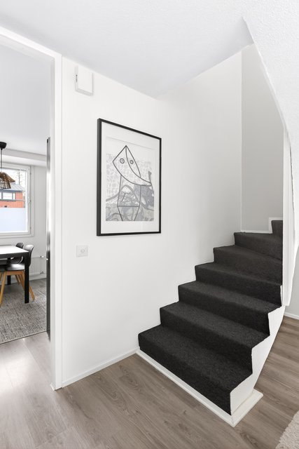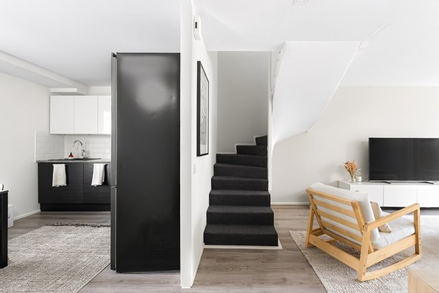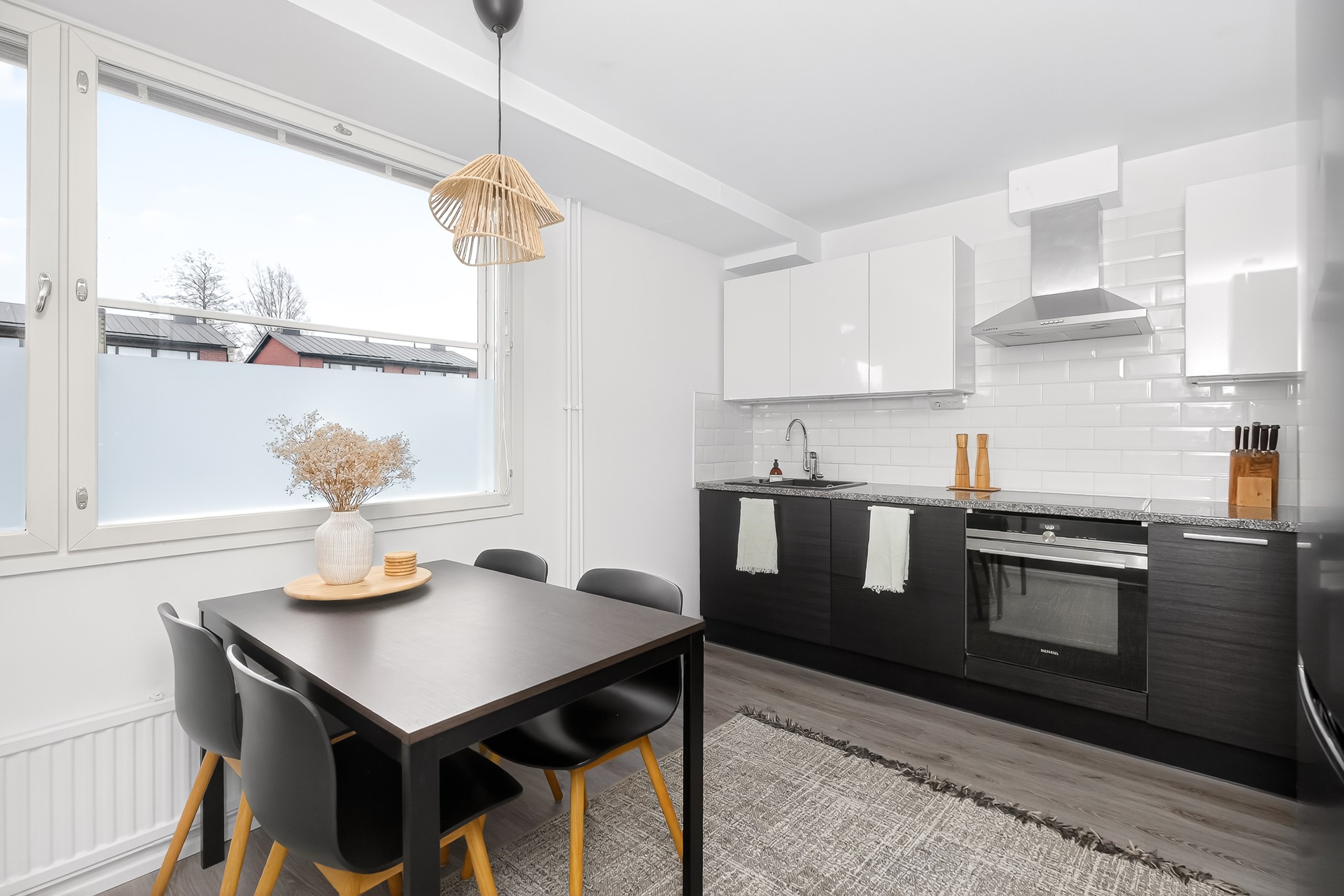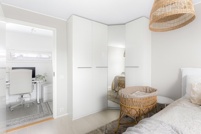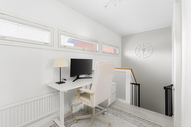 Keittiö on remontoitu tyylikkäästi vuonna 2015 ja tarjoaa runsaasti kaappi- ja laskutilaa sekä paikan ruokailuryhmälle, Puustellin kaapistot ja kiviset työtasot luovat modernin ja toimivan keittiöympäristön. Yläkerran kaksi makuuhuonetta ovat tilavia ja varustettu kaapistoilla sekä ikkunallinen aula on oiva paikka työpisteelle.
