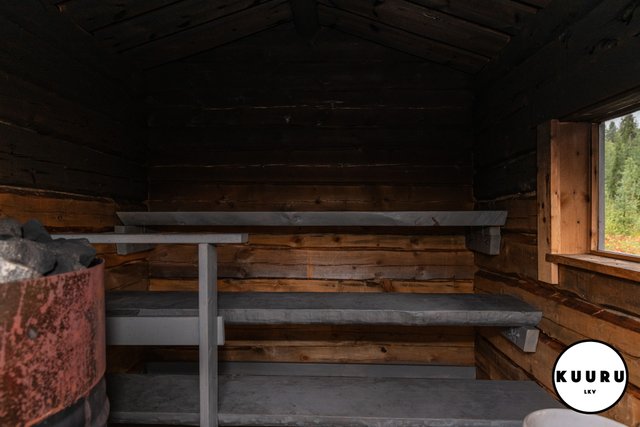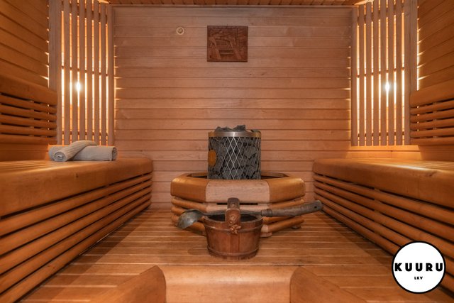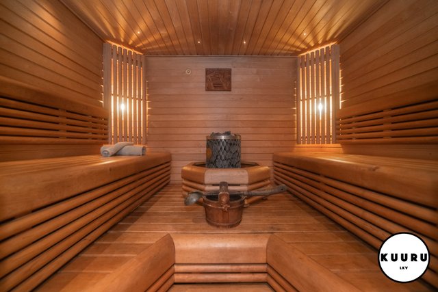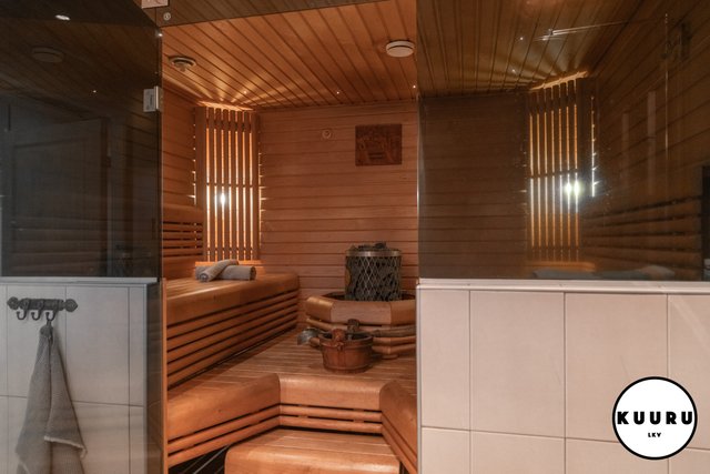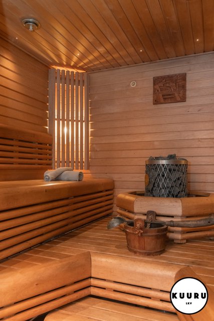 - Saunassa on moderni kiuas, jonka ympärille sijoitetut lauteet molemmin puolin luovat avaran ja sosiaalisen tunnelman. Ratkaisu tekee saunasta erinomaisesti myös isommille saunaporukoille soveltuvan.