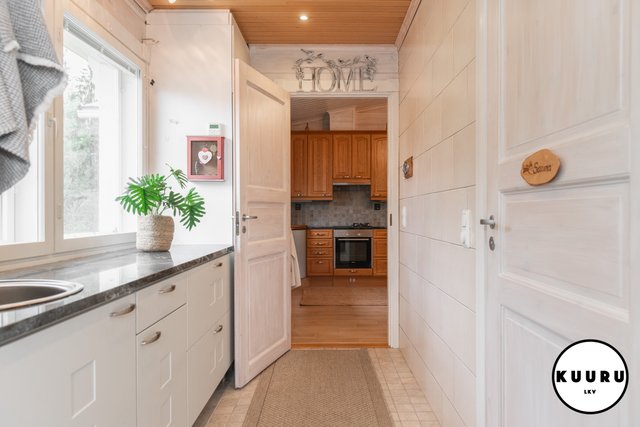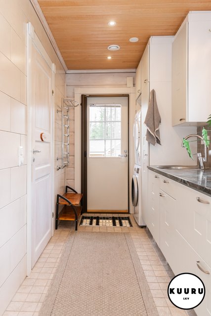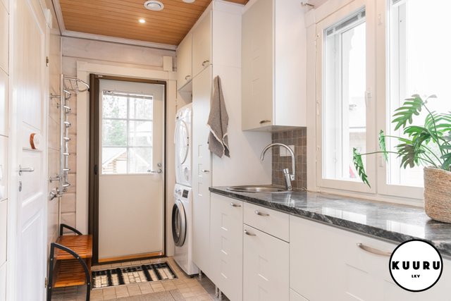 - Kodinhoitohuone sijaitsee kätevästi heti sisäänkäynnin yhteydessä, mikä helpottaa muiden tilojen puhtaanapitoa. Ratkaisu sopii täydellisesti aktiivista elämäntapaa harrastaville ja koiraperheille, sillä tilan kautta on helppo huolehtia kodin siisteydestä arjen touhujen jälkeen.
