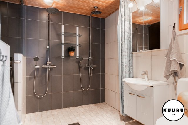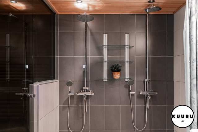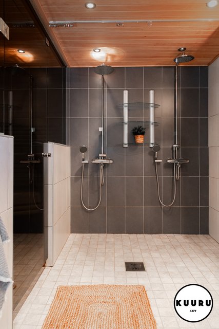 - Tilava ja moderni pesuhuone, jossa on kaksi tyylikästä sadesuihkua. Pesutiloista löytyy myös wc ja käsienpesuallas. Lasiseinä erottaa pesutilat saunasta, mikä tuo kokonaisuuteen avaruutta ja lisää viihtyisyyttä.