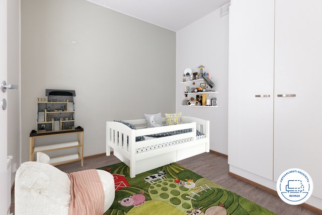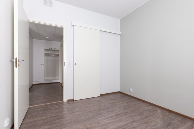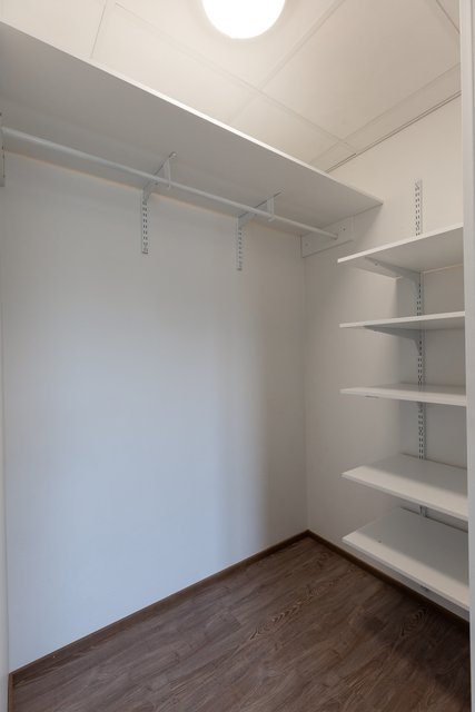 - Yhdessä makuuhuoneessa on kaapisto, toisen yhteydessä on liukuovellinen vaatehuone.