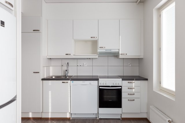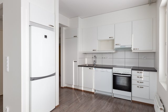 - Jääkaappipakastin, liesi, liesituuletin, astianpesukone, ja kiinteät valaisimet
